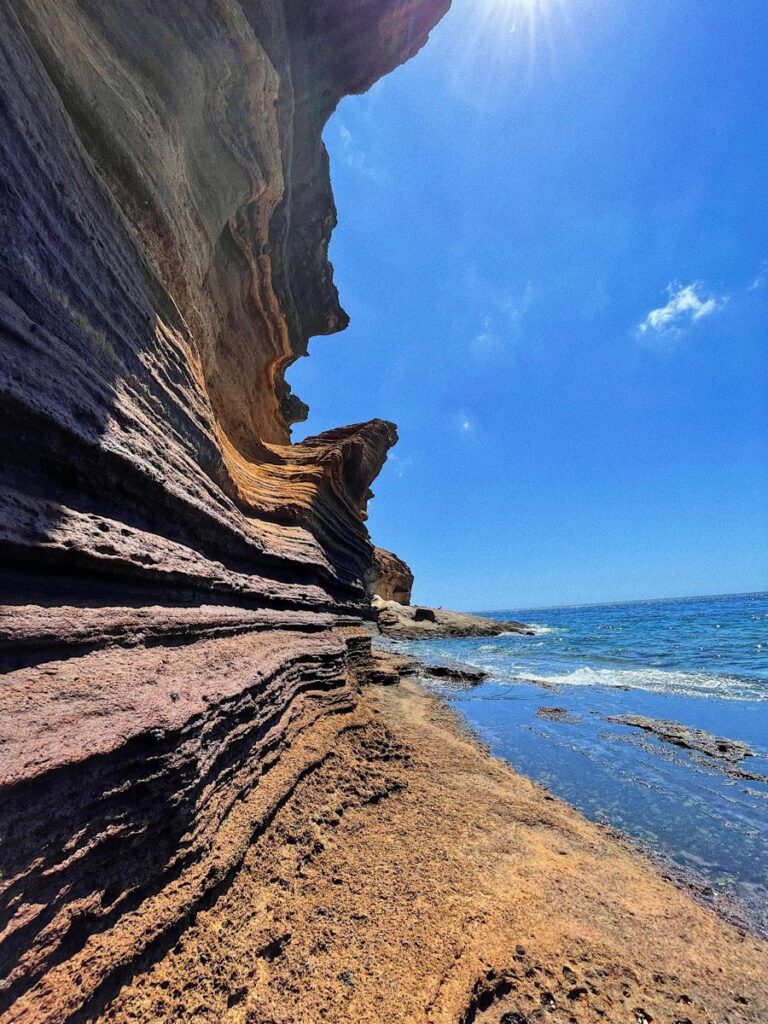 To nie jest zwykła, piaszczysta plaża z leżakami i parasolami. Montaña Amarilla to Monumento Natural – miejsce chronione, bo natura naprawdę się tu postarała. Żółto-złote klify przypominają krajobraz z innej planety, a kiedy słońce zaczyna zachodzić, gra świateł na skałach to coś, co trzeba zobaczyć na własne oczy.