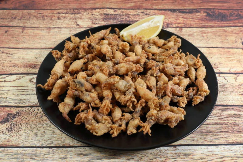 Małe kalmary, pokrojone w paski szerokości 2-3 cm i smażone w panierce na głębokim tłuszczu – drobniejsza wersja typowych kalmarów.
